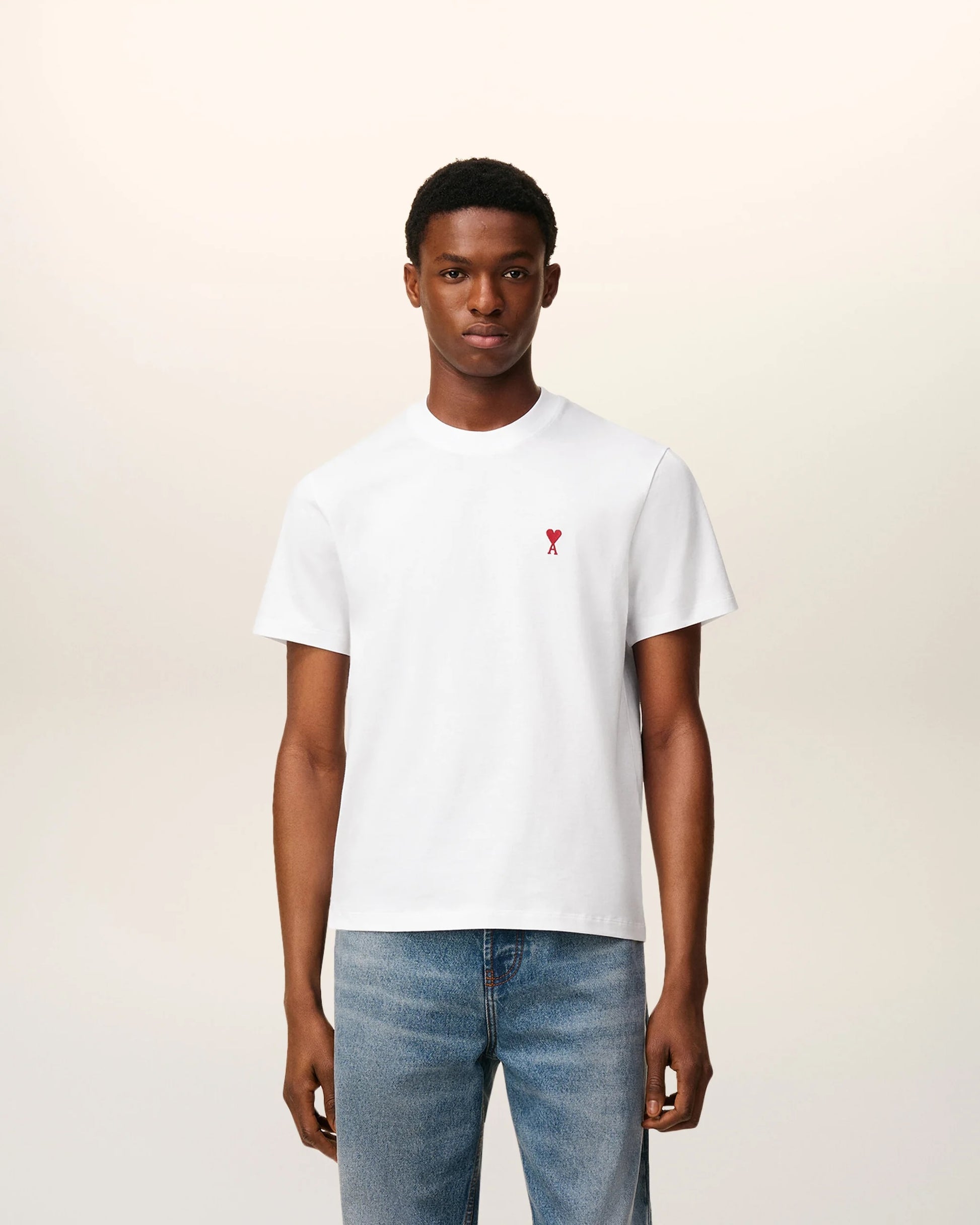Ce T-shirt iconique de la maison Ami Paris arbore le célèbre logo Ami de Cœur brodé, incarnant élégance et simplicité. La coupe est pensée pour un look décontracté (relaxed fit) avec des épaules tombantes, offrant une silhouette moderne et facile à assortir.